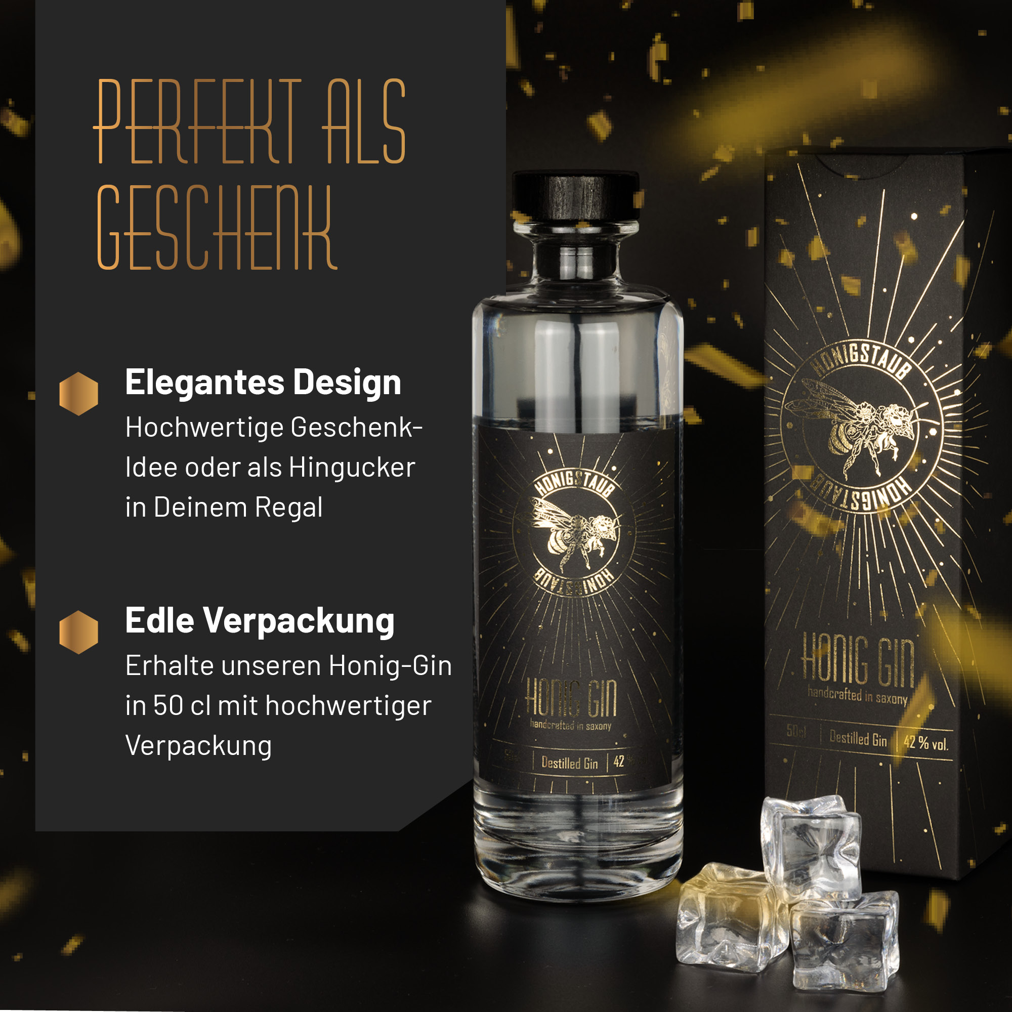 Honig küsst Gin! Unser Honigstaub Premium Gin wird aus erlesenen Botanicals gebrannt und mit einem Hauch Honig verfeinert. Dieser in Sachsen handgebrannte und destillierte Gin schmeckt samtig weich. Der Honig wirkt als Geschmacksverlängerer und rundet die erlesenen Botanicals ab. Somit kann Honigstaub Honig Gin sowohl pur wie auf Eis und gemixt mit Tonic genossen werden. Die 50cl Flasche kommt im hochwertigen Geschenkkarton. Eine super Geschenkidee für jeden Gin- und Honigfreund.